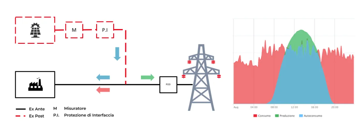 In questo modo l’utilizzatore preleva la maggior parte dell’energia necessaria alla propria attività dal fotovoltaico (energia blu), mentre l’energia prodotta in eccesso viene immessa in rete (energia verde).